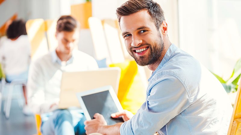 Mann som støtter haken mot hendene og smiler. Foran han er det en PC, i bakgrunnen ser man en rekke bord og palmer i det fjerne.