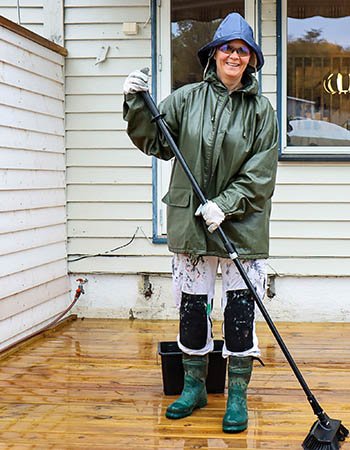 Vi anbefaler ikke hjemmelagde blandinger bestående av oppvasksåpe, grønnsåpe, salmiakk og så videre. I verste fall risikerer du å skade treverket. Midler som er laget for formålet er skånsomme mot treverket og effektive mot smuss, sopp og alger, fremhever Chera Westman.