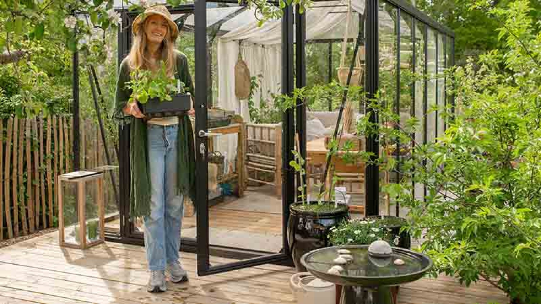 – Jeg er opptatt av at drivhuset ikke skal bli et sted der vi stabler hagemøbler eller lagrer bildekk. Så jeg har laget plass for trær, hengt opp gardiner og solcellebelysning i taket og lagt inn puter og små detaljer som gjør det hyggelig å være der. Det gjør at jeg bruker drivhuset hele året. Det er faktisk veldig koselig både om høsten og utover vinteren, med et lite juletre der inne, sier hun.